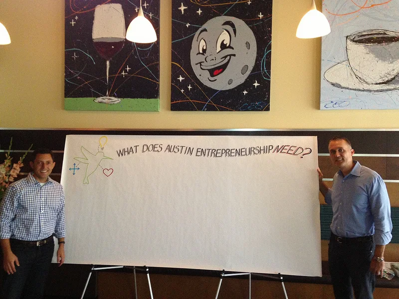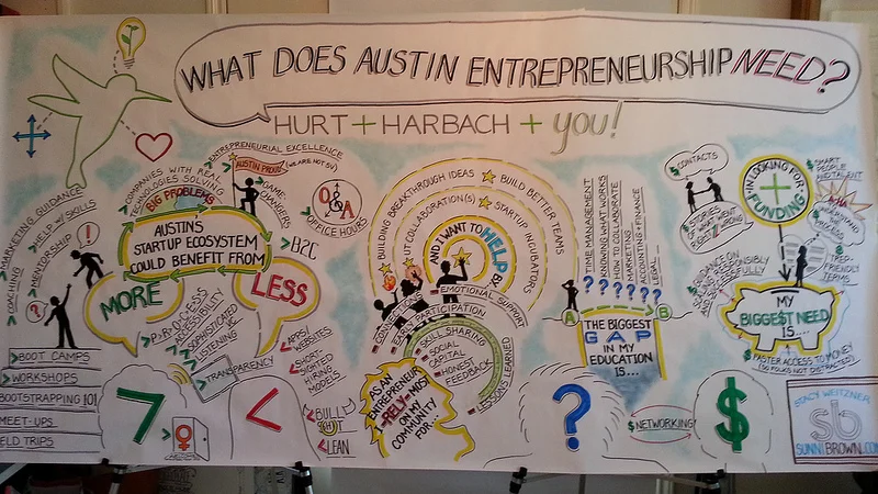 We want to thank all of the hummingbirds that braved the rain (well, it looked like it was going to rain, at least!) to share their ideas with us and each other. Again, it was a night we'll never forget. The beginning of a dialogue that we hope will change the entrepreneurial landscape in Austin for the better. We'll keep turning back to this mural, which will be proudly displayed in our office, and your ideas - it is our roadmap for the future of Hurt+Harbach. Thanks again to Lola Savannah, and to Sunni Brown, Ink, for their awesome work, and we'll see you on September 20! Let's keep the conversation going…
